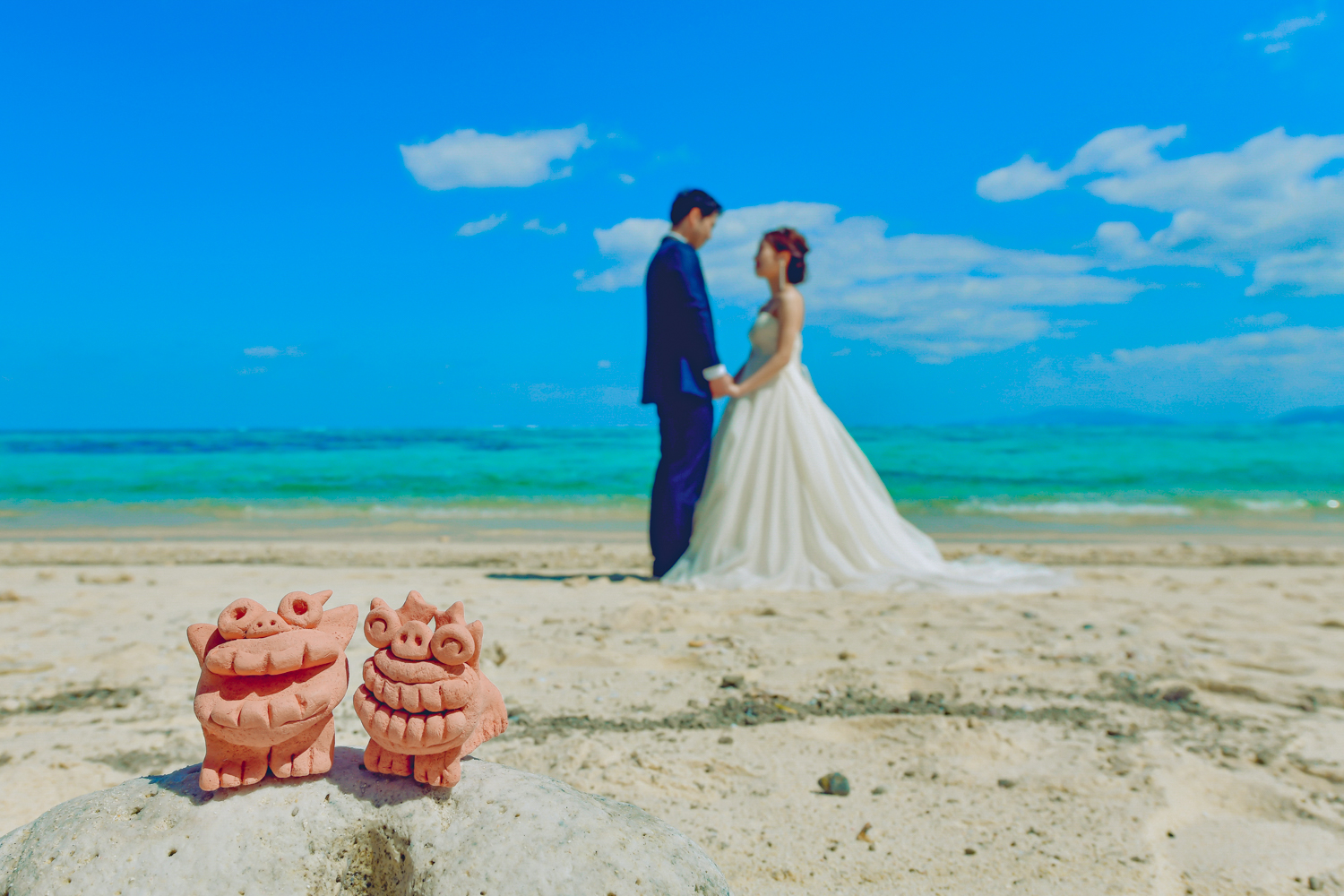 可愛いシーサーは前日にお二人が手作りしたものです。また、シルバーのヒールも撮影小物としてお持ちいただきました。